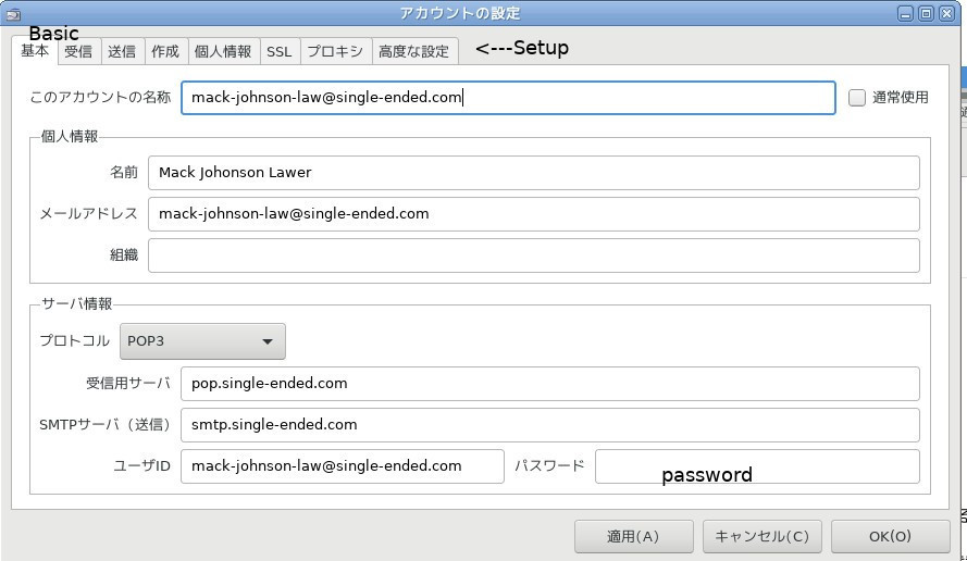 PORT の設定はプロバイダーによって違いがあります。この場合はsingle-ended.com の場合は POP は 110 SMTP は 587 になります。